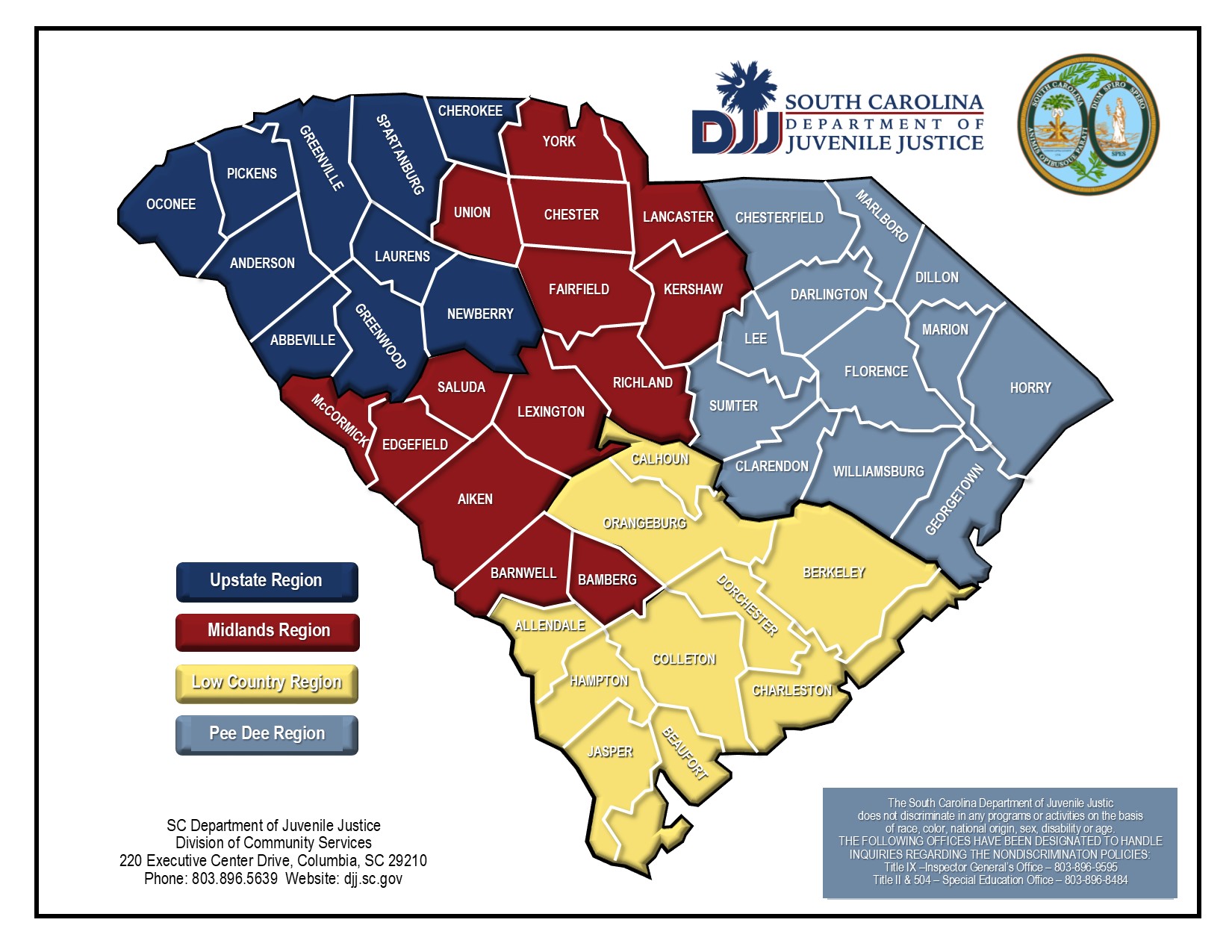 SCDJJ provides services to juveniles and their families in the community through 43 SCDJJ county offices, servicing all 46 counties in the state. Community case managers are involved with juveniles from the moment they enter the system until they complete probation and/or parole. The county staff conducts detention screenings and intake interviews, complete risk/needs assessments and make recommendations to the family court for disposition. Case managers also coordinate case diversion, supervise youth on probation or parole, and participate in prevention initiatives.